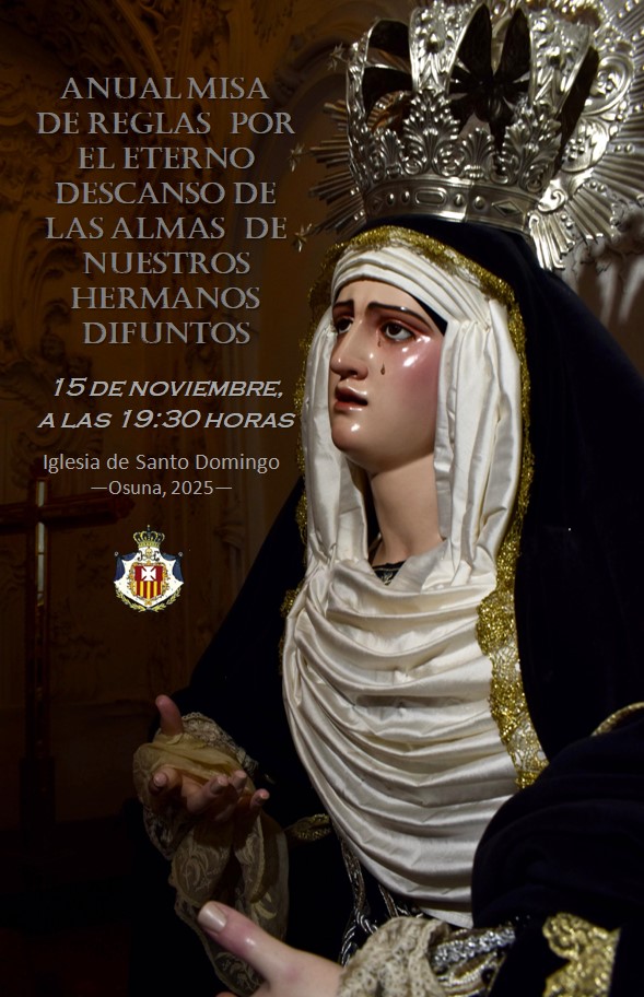 El próximo día 15, lunes, festividad de los Dolores de la Santísima Virgen María, la Hermandad ofrecerá en la iglesia de Santo Domingo, sede canónica de nuestra Humilde Esclavitud Mercedaria, la solemne función a Nuestra Señora y Madre de los Dolores que prescriben las Reglas.