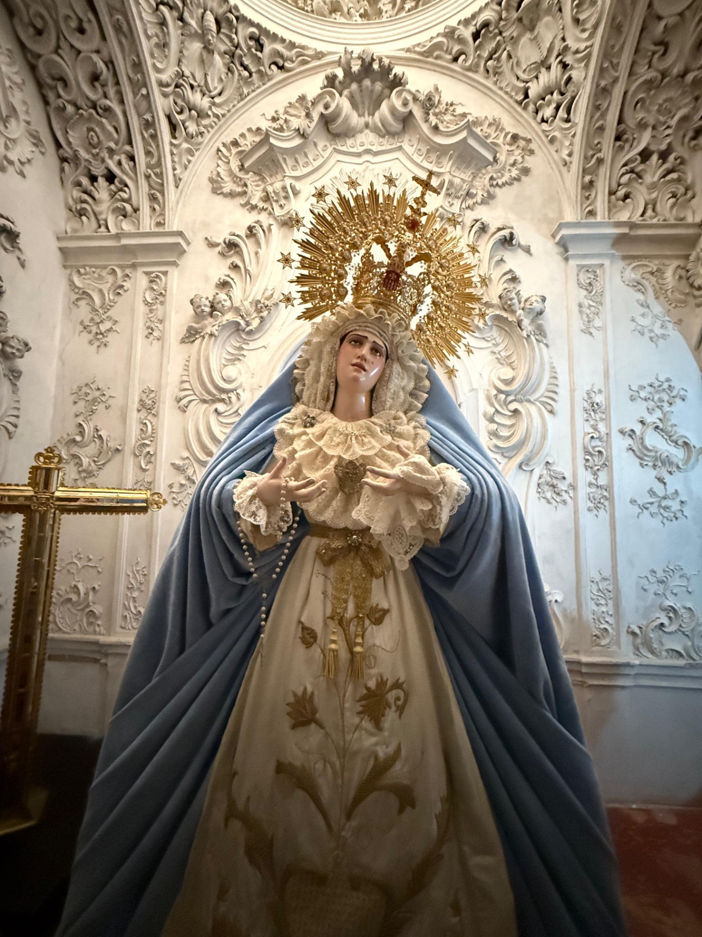 La Virgen luce piezas bordadas por N. H. Joaquín Arauz, de cuyo fallecimiento se cumplen ahora ocho años