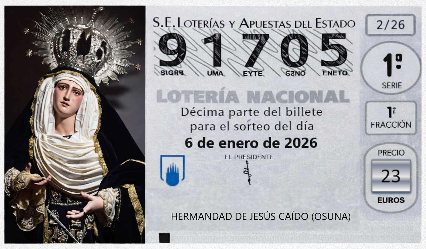 Nuestra Hermandad se ha quedado sin billetes del 91705 para el sorteo del Niño de la Lotería Nacional. En una semana ha vendido las 55 series correspondientes a este precioso número que, como el distribuido para el reciente sorteo de Navidad y premiado con 100 euros, presenta los dígitos del año fundacional de nuestra Humilde Esclavitud Mercedaria: 1705.
