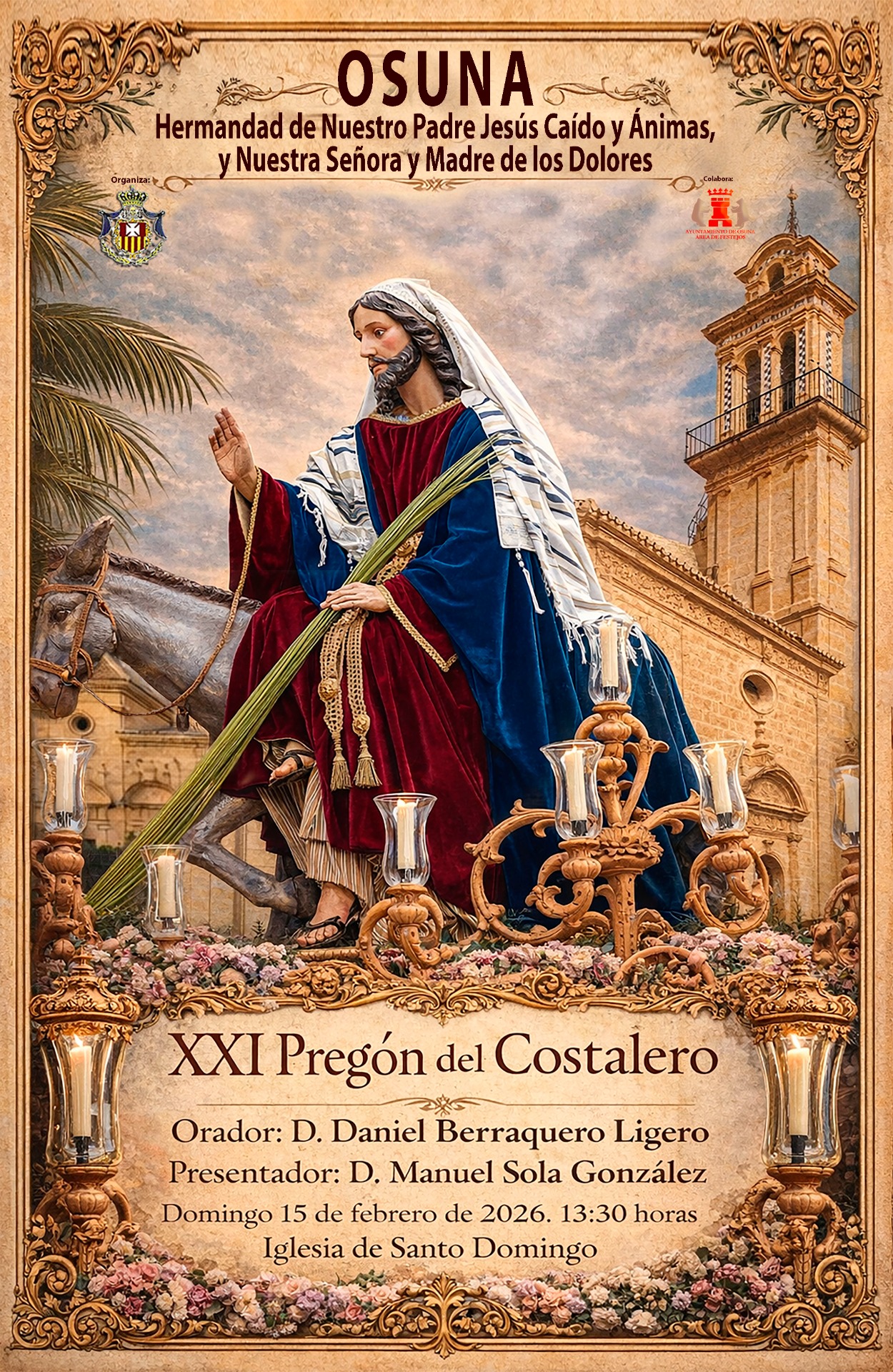 Ya se conoce el cartel del XXI Pregón del Costalero, exaltación cofradiera que habrá de celebrarse el próximo día 15 de febrero, domingo anterior al miércoles de Ceniza, a las 13:30 horas. El cartel, realizado por don Rafael Romero, del Área de Cultura del Ayuntamiento, tiene como motivo principal la imagen del Señor de la Triunfal Entrada en Jerusalén, sagrado titular de la Hermandad del Dulce Nombre de Jesús, sobre la base de una fotografía original de Pepe Marquina.